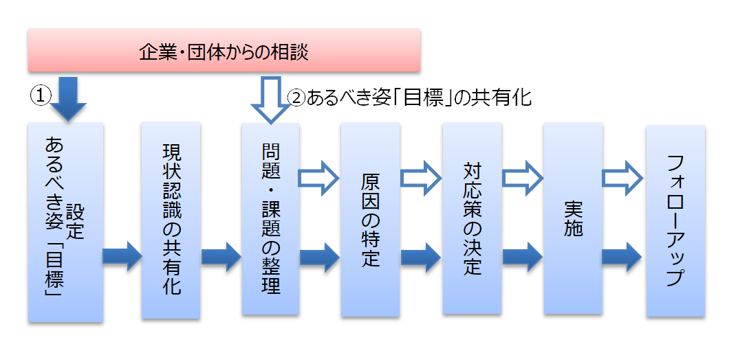 - MIRAI職場のコンサルティングは、基本的にはお客様と共同プロジェクトチームを結成し、次のステップで行います。